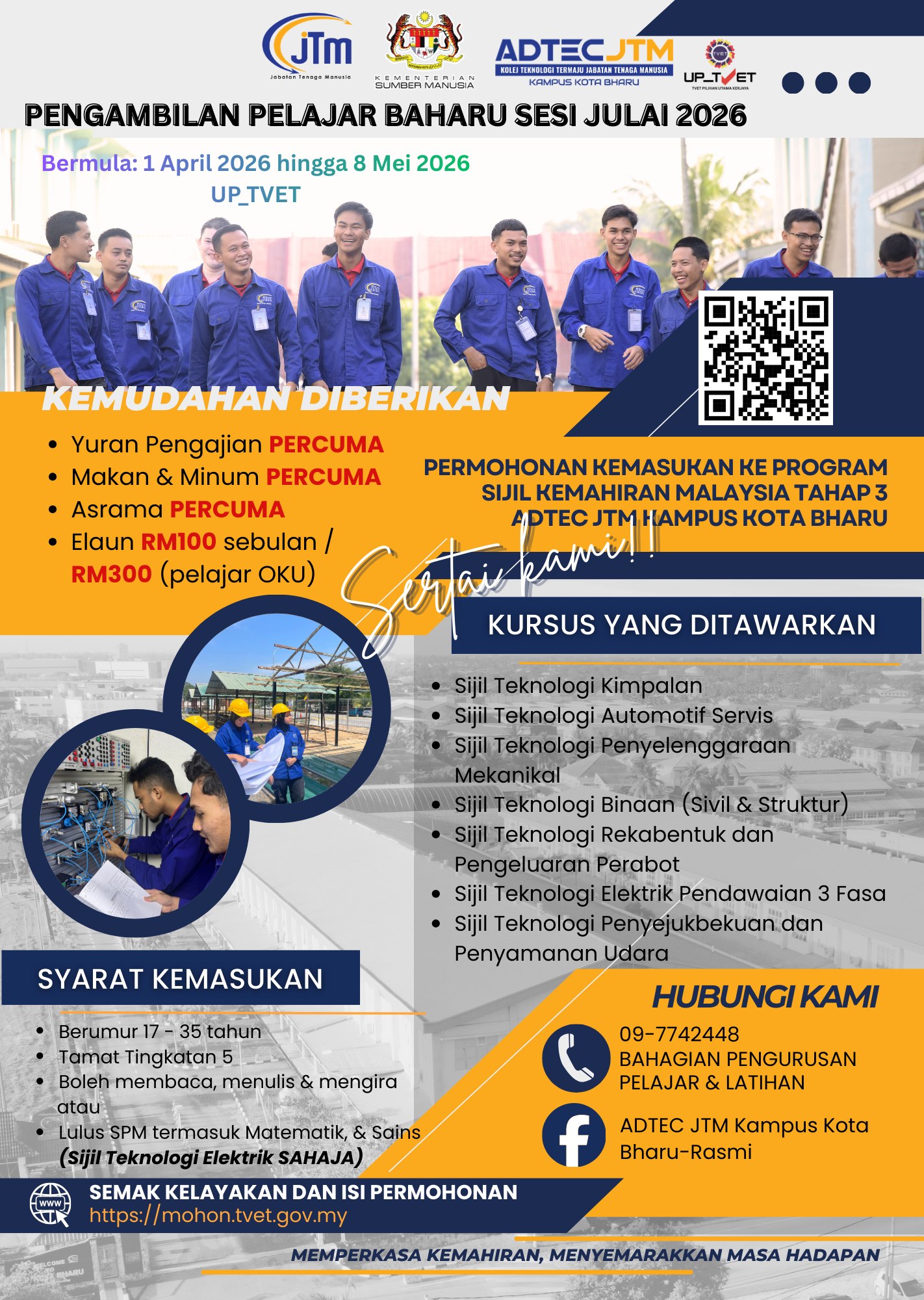 Telah dimuat naik iklan PERMOHONAN KEMASUKAN KE ADTEC JTM SESI JULAI 2026.