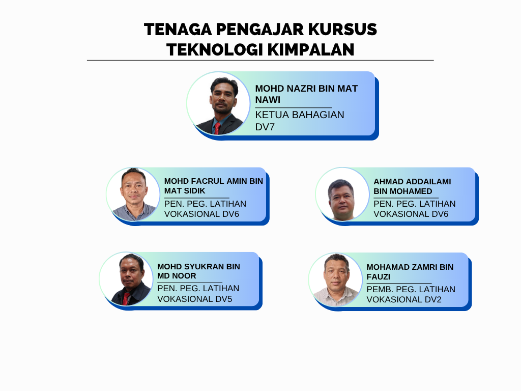 Dalam kursus ini, pelajar akan diajar mengenai kaedah pemotongan, membuat kimpalan jenis arka dan gas, membuat kimpalan ke atas logam dari logam-logam jenis feros dan bukan feros, membaca simbol dan lukisan cetakan biru serta menguji sambungan kimpalan dengan cara membedah. membengkok dan merenggang logam.
