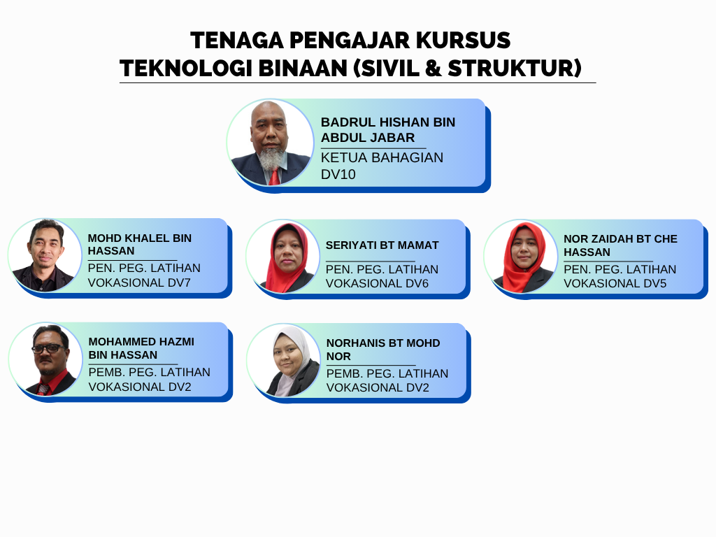 Dalam kursus ini, pelajar akan dibekalkan dengan pengetahuan dan kemahiran secara teori dan amali dalam bidang sivil dan stuktur. Pelajar juga dipersiapkan untuk menjalankan aktiviti-aktiviti pengurusan, penyeliaan dan kepimpinan. Membuat perancangan serta menghasilkan program kerja sivil dan struktur termasuk kerja-kerja penyeliaan tapak. Pelajar diajar untuk menjalankan kerja-kerja kawalan kualiti meliputi ujian makmal dan ujian di tapak, menyelia kerja-kerja penyelenggaraan binaan struktur dan infrastruktur dan melaksanakan latihan dalam pembinaan substruktur dan superstruktur,kerja-kerja pembinaan infrastruktur meliputi jalan raya, saliran, sistem bekalan air, dan sistem kumbahan dengan mengaplikasikan teknologi semasa dalam binaan.
