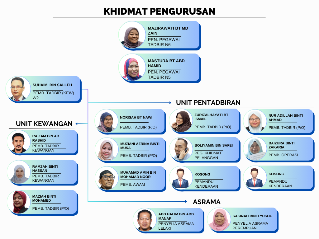Mengurus dan menyelaras tindakan-tindakan yang perlu dilakukan berkaitan dengan pentadbiran, personal, pusat sumber, kewangan dan penyelenggaraan stor diurus dengan sistematik dan terkini.